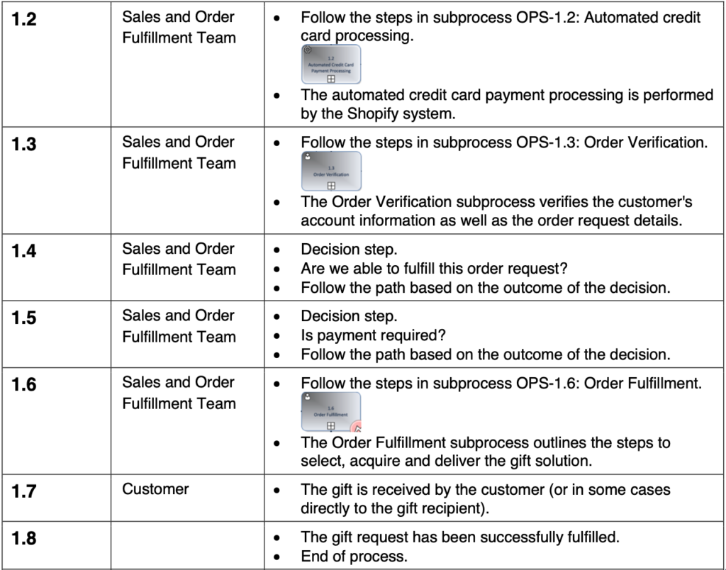 A cross-functional visual process map (known as level 3 process) will provide an overview of the process steps and include functional roles and/or departments. However, this process map will not provide enough detail to explain “how” a step is to be executed.